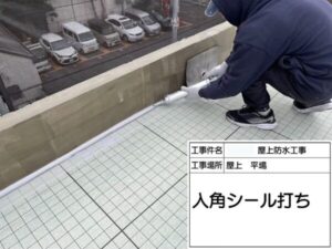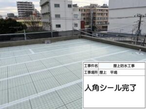 防水トラブルが起きやすい入角(立ち上がり・角部)には下地を入れ、入角シールで丁寧に補強しています。