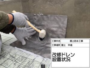 改修ドレンとは屋上やベランダなどの劣化した既存の排水口(ドレン)の上に被せて設置する新しい排水部品で、既存のドレン周りを解体せずに、新しい防水層と確実に接続して排水機能を回復・向上させ、雨漏りを防ぐ目的があります。